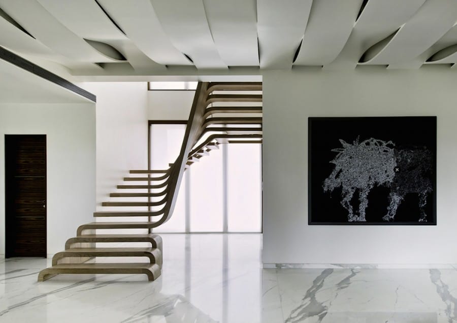 Desain tangga yang satu ini dinamakan tangga gantung. Dengan material kayu yang membuat suasana rumah menjadi nyaman, Arquitectura en Movimiento membuat tangga yang seolah terlihat menggantung pada dinding rumah.