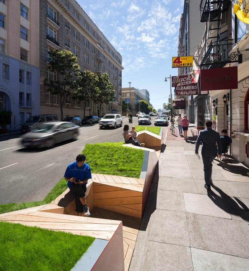 Masih di San Francisco, desain parklet yang satu ini dibuat oleh Matarozzi Pelsinger Desaign + Build. Desain dibuat berbentuk menyerupai segitiga dengan sudut tepat 45 derajat, material bahannya berupa kayu.
