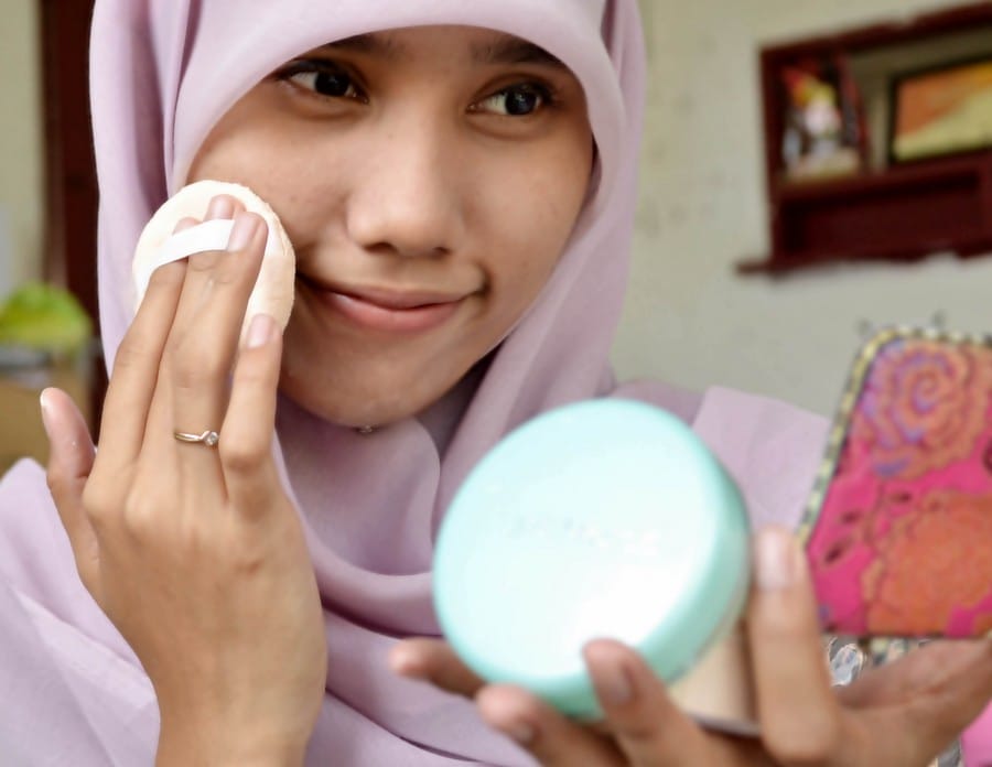 Menggunakan bedak dapat mengurangi kesan kumal wajahmu. Tak perlu terlalu tebal sehingga warna kulit tangan dan kulit wajahmu terlihat kontras. Sapukan bedak seperlunya saja.