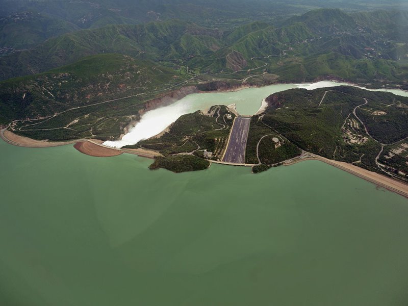 Tarbela Dam membendung sungai Indus di Pakistan. Proyek bangunan ini selesai pada tahun 1974.