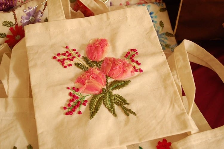 Kamu bisa menyulamnya pada tas selempang polos sederhana yang bisa kamu hunting dengan mudah di pasar atau grosir perkotaan. Selain tas selempang, bahan lain seperti kaos kaki atau baju anak – anak juga bisa kamu sulam dengan kreasi ciamik.