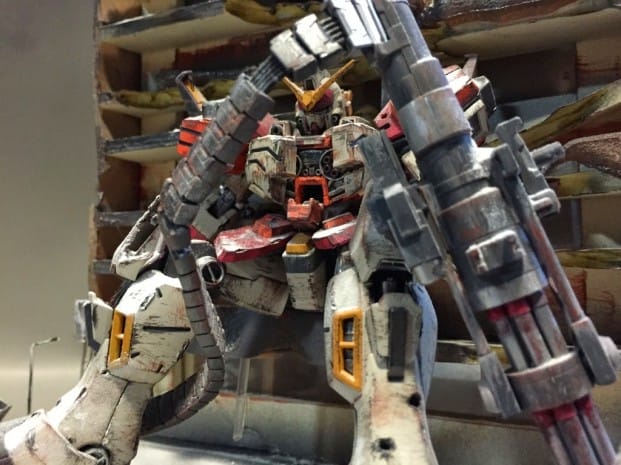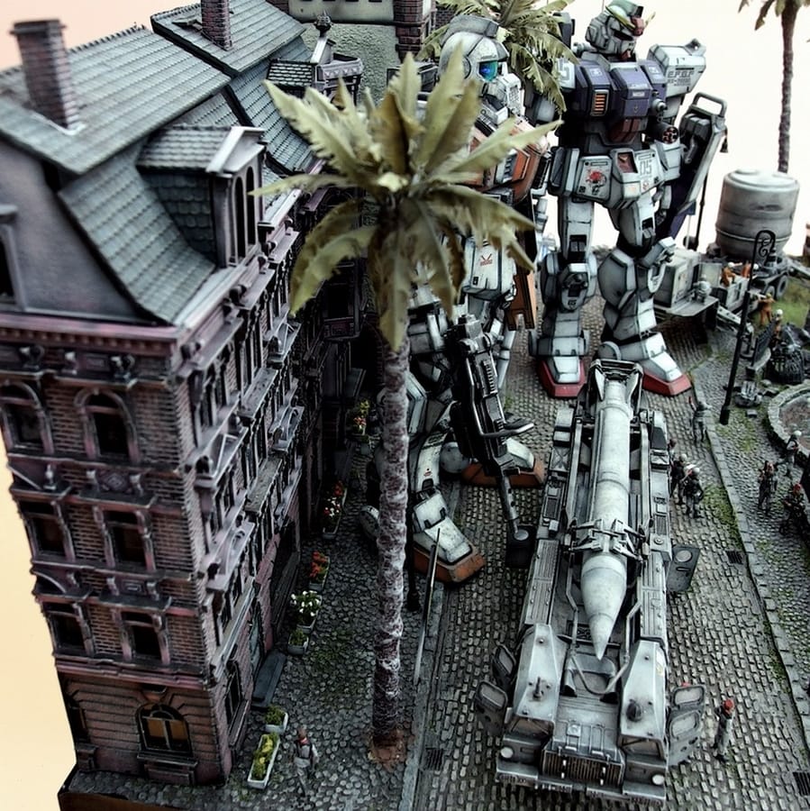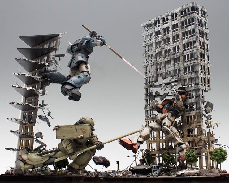 Lengkap dengan detail warna dan mobil mobil. Suasana perkotaan yang hancur karena pertempuran. Dibuat oleh seorang modeller bernama coralblue76. Dapat kamu lihat galeri lengkapnya di web gundamkitscollection.
