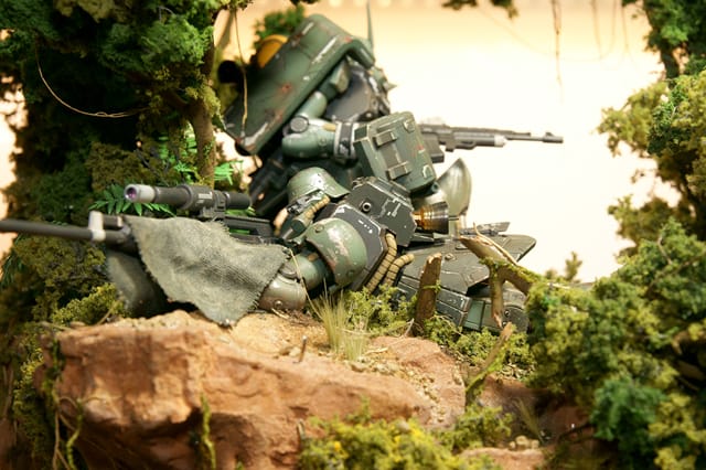 Dibuat oleh intermezzo0224 alias satoshi honjo. Menampilkan detil hutan yang sangat natural dengan rimbunny pohon. Pemilihan unit pengintai yang bisa berbaur dengan warna hutan. Sungguh sangat bagus diorama ini.