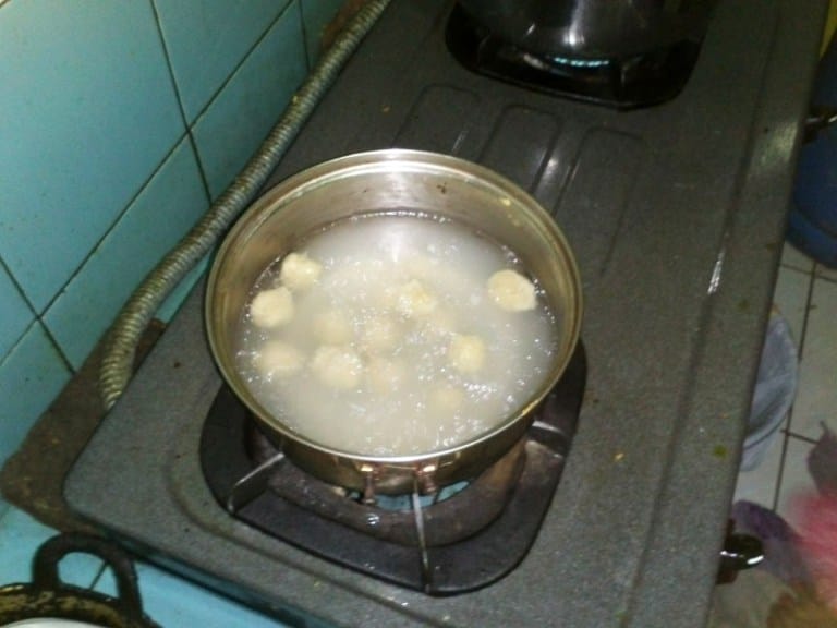 Nah, setelah itu tinggal dimasukkan bulatan-bulatan bakso itu pada kuah atau air mendidih. Jika bakso itu sudah mengapung, berarti sudah matang dan siap untuk ditiriskan. Sebaiknya juga tidak terlalu lama bakso berada di air mendidih. Sebab kalau kelamaan jadinya bagian luar bakso bakal pecah-pecah.