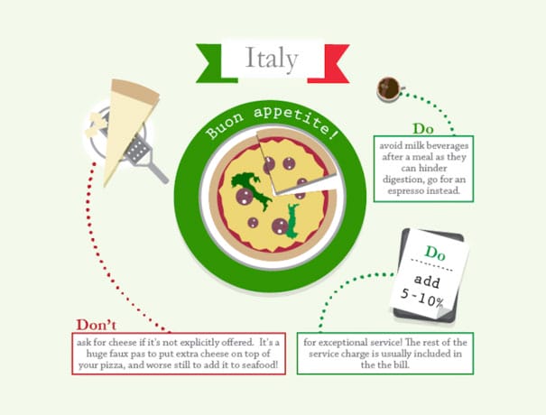 Ada hal yang unik tentang keju dan etika makan di Italia. Jika kamu memakan pizza, jangan meminta tambahan taburan keju jika tidak ditawari. Sikap meminta keju tambahan ini adalah ketidaksopanan yang besar dalam etika makan di Italia.