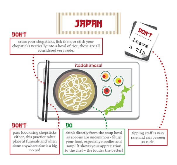Jangan pernah meninggalkan tip atau bonus bagi petugas restoran, orang Jepang menganggap ini tidaklah sopan. Lebih dari itu, jangan pernah meletakkan sumpit dalam posisi menyilang, hal ini jauh lebih kasar dan sangat tidak sopan.