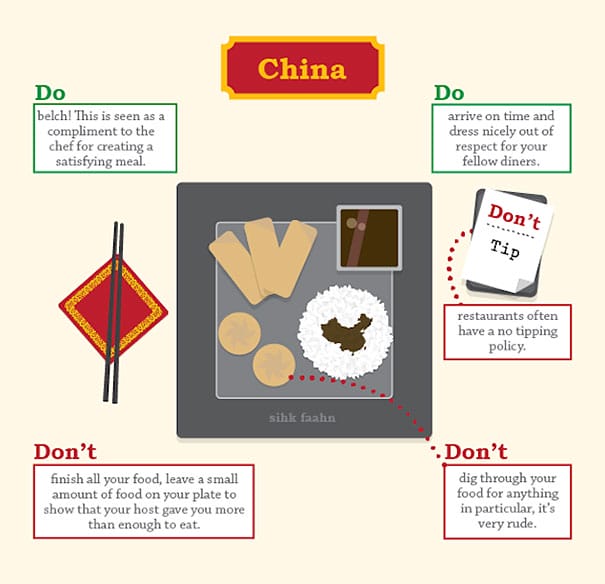 Hal yang lucu adalah kamu akan dianggap tidak sopan di China jika menghabiskan makanan kamu. Sisaka sedikit makanan untuk menunjukkan bahwa tuan rumah memberikan makanan lebih dari yang kamu butuhkan.