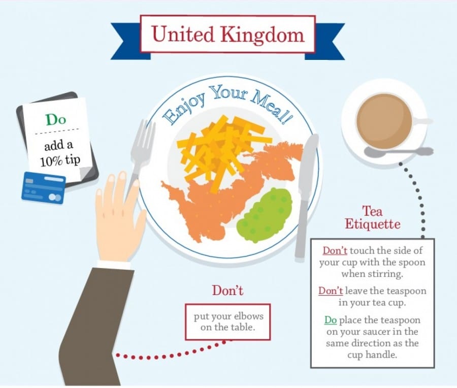 Di Inggris kamu juga harus memberikan uang tip. Dan jangan pernah meletakkann siku atau lengan kamu di atas meja. Serta jangan meninggal kan sendok teh di dalam gelas teh.