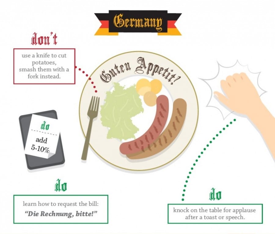 Kalau di Jerman, minimal kamu harus memberikan tip sebesar 5%. Selain itu, pisau tidak digunakan untuk memotong kentang, gunakan garpu untuk membagi kentang pada potongan yang lebih kecil.