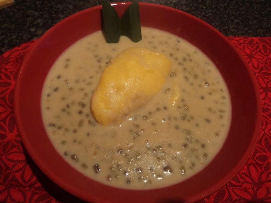 Langkah pertama, rebuslah kacang hijau sampai merekah, kemudian masukan buah durian. Selanjutnya, tambahkan larutan maizena (maizena dicampur air).