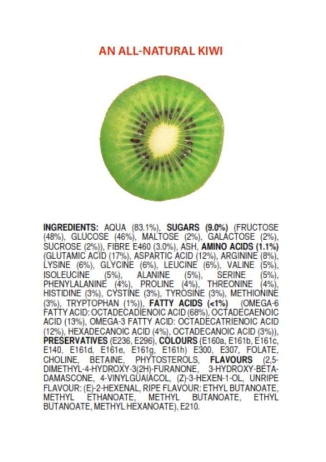 Jadi, pada dasarnya semua bahan segar pun mengandung berbagai ‘bahan kimia’. Nah, bagaimana jadinya jika buah – buah segar dan beberapa komoditas bahan makanan dibuat menjadi poster dengan tampilan komposisi seperti makanan pabrik?