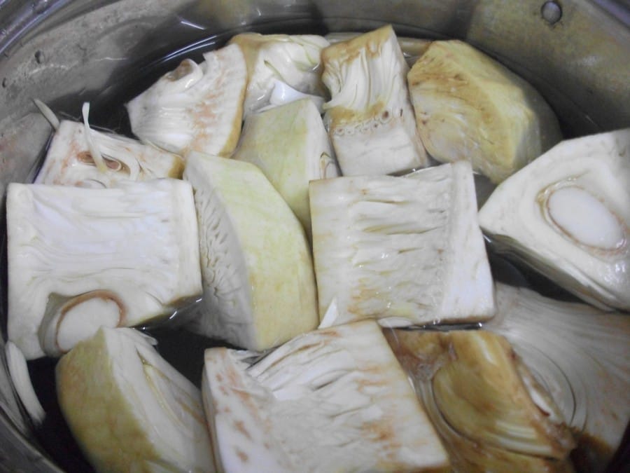 - Pertama rebus nangka dengan bumbu halus dan air secukupnya dalam kuali khusus untuk membuat gudeg. Tunggu hingga warna nangka berubah agak memerah dan terasa empuk.