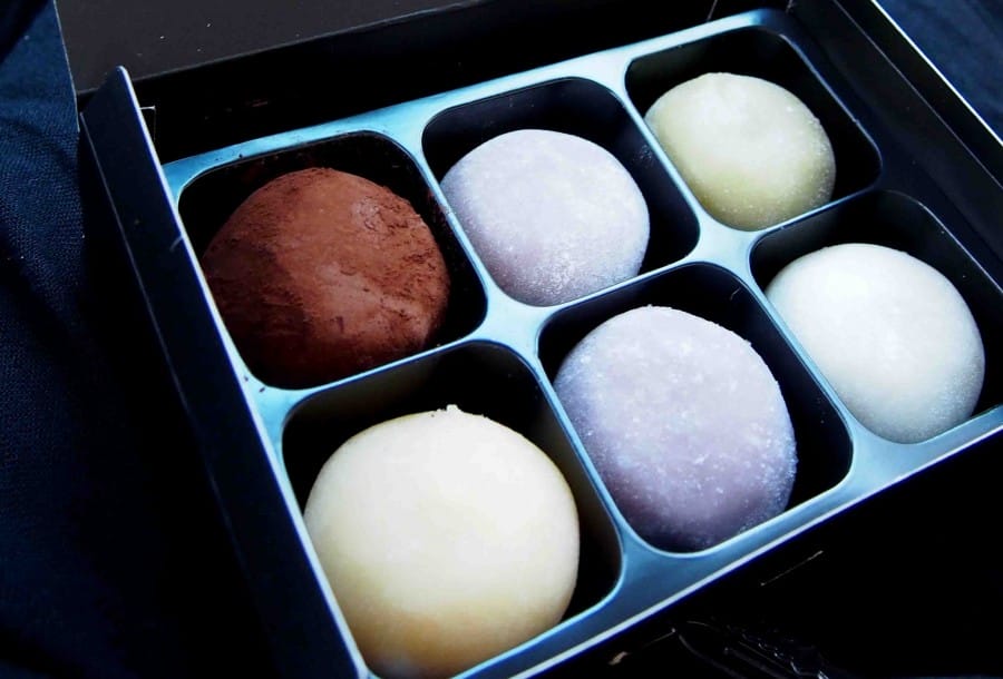 Kue mochi biasanya diselimuti dengan tepung kanji putih seperti bedak. Isi coklat kacang membuatnya pas dikombinasikan dengan tepung ketan sebagai bahan bakunya.
