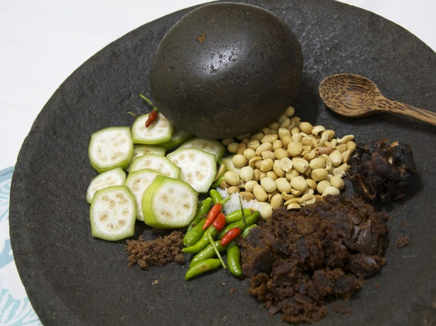 Langkah pertama, kita ulek cabe rawit ditambah garam, lalu dicampur dengan gula merah, kacang tanah dan asam jawa. Semua bumbu-bumbu itu kita halus sampai semuanya tercampur merata. Untuk kacangnya, kita bisa giling kasar, agar sensasi gurihnya terasa ketika digigit. Kalau bumbunya sudah jadi, rujak pun siap untuk disantap.