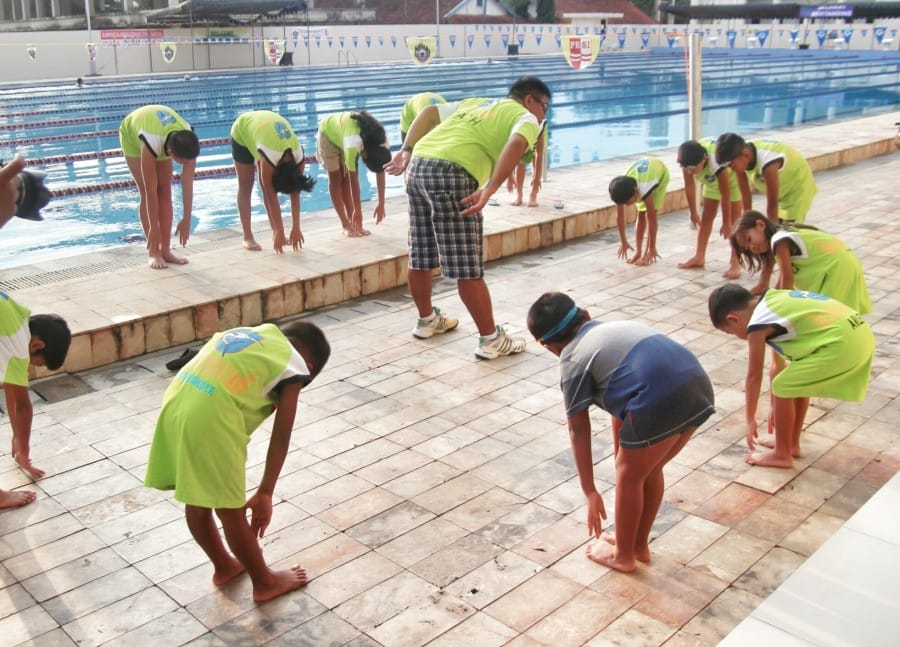 Sebelum berenang, lakukanlah pemanasan terlebih dahulu untuk merenggangkan otot-otot tubuh supaya tidak kaku. Pemanasan juga berguna untuk mencegah terjadi kram ketika kamu melakukan gerakan-gerakan renang saat berada di dalam kolam renang.