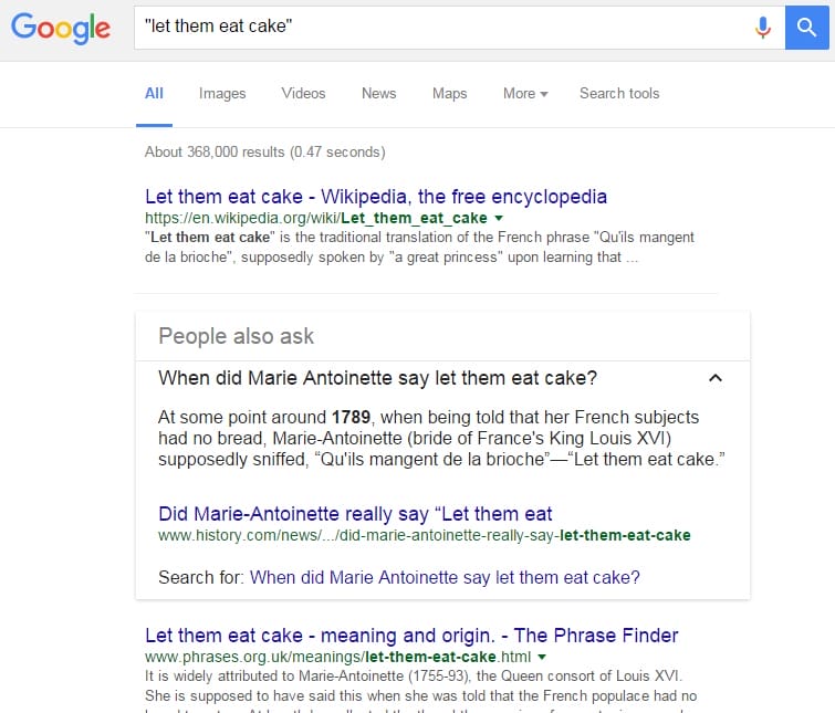 Misalkan jika kamu ingin mencari kalimat let them eat the cake, maka kamu harus mengetikkan “let them eat the cake” pada kolom pencarian Google. Dengan cara ini, hasil pencarian yang kamu dapat akan spesifik pada frasa let them eat the cake.