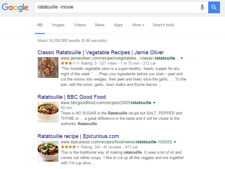 Dengan menyelipkan tanda minus atau “-“, kamu bisa mengeliminasi hasil yang keluar pada Google. Misalnya jika kamu mengetik ratatouille -movie, maka semua hal yang berhubungan dengan film ratatouille tidak akan ditampilkan.