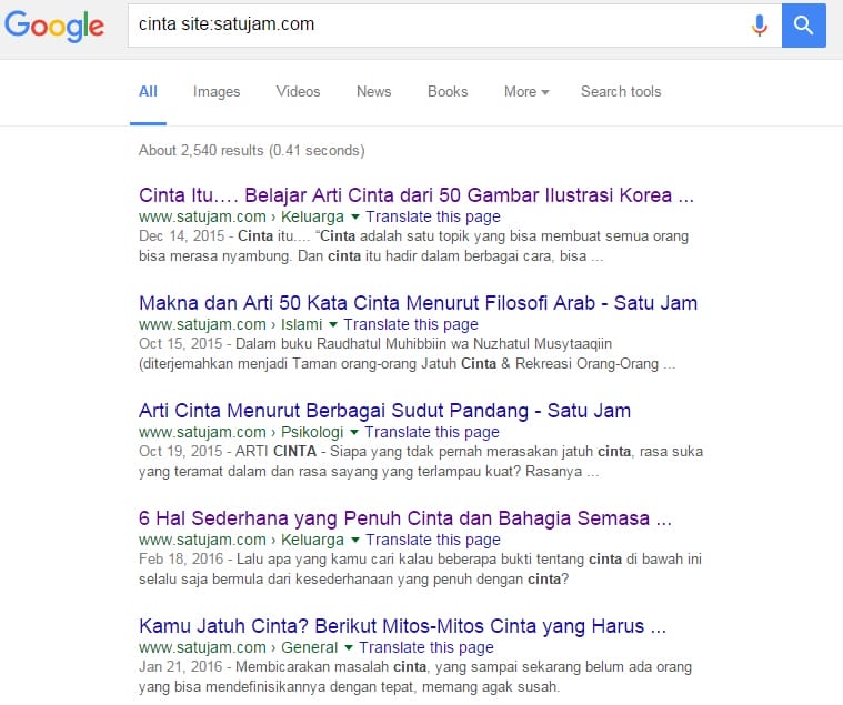 Gunakan tanda “site:” untuk mencari secara spesifik. Misalnya jika kamu ingin mencari kata “cinta” pada situs satujam.com, maka kamu harus menuliskan cinta site:satujam.com pada kolom pencarian Google.