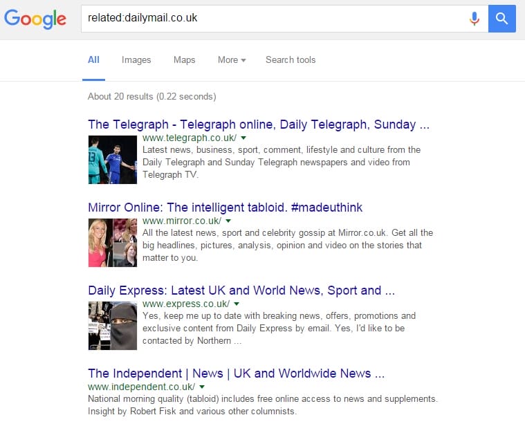 Contohnya jika kamu mengetikkan related:dailymail.co.uk maka hasil yang kamu dapat adalah seperti pada gambar di atas. Kamu akan mendapatkan beberapa situs serupa seperti Mirror, Telegraph, Daily Express atau The Independent.