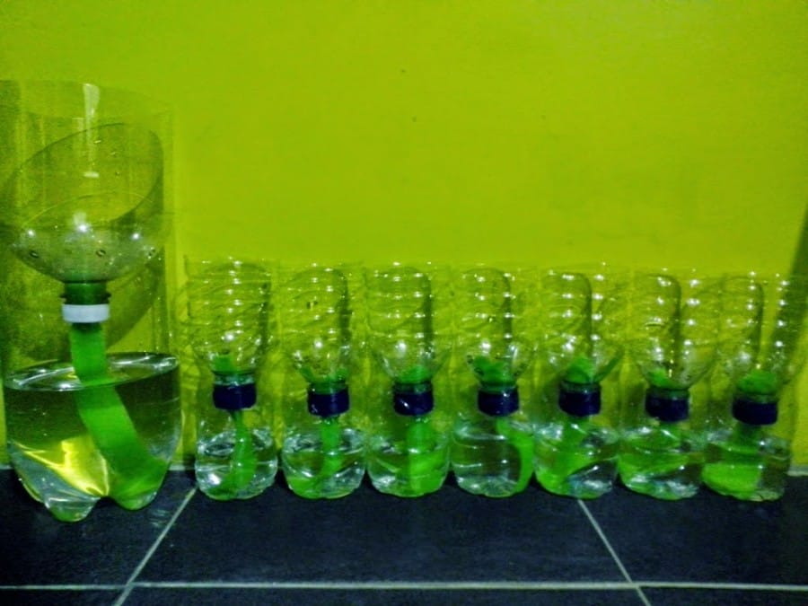 Pertama, potong masing-masing botol menjadi dua bagian dan buatlah lubang dengan diameter 1 cm. Tutup botol dibiarkan ditempatnya saja, jangan dilepas dan berikan lubang di tengahnya.